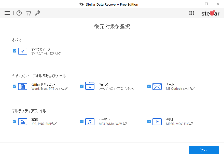 Stellar Data Recoveryを起動します。復元対象はすべてを選択します。
